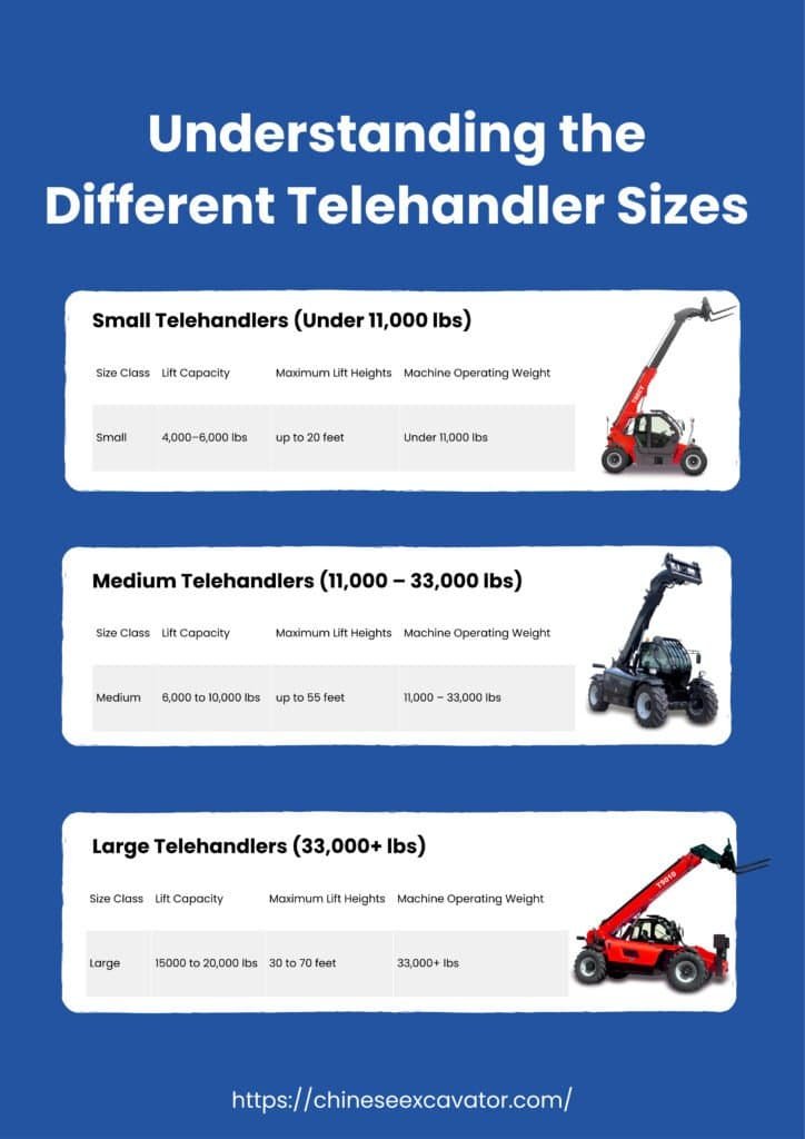 Telehandlers are commonly classified into three size categories based on operating weight and lifting capacity: small/compact (under 11,000 lbs), medium (11,000–33,000 lbs), and large/high-capacity (over 33,000 lbs).
