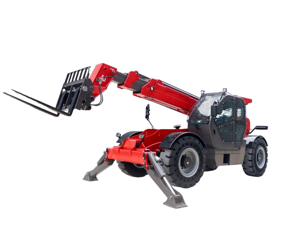 The telehandler features high ground clearance, strong torque output, optional 4WD, and excellent climbing ability for uneven or challenging jobsite conditions.